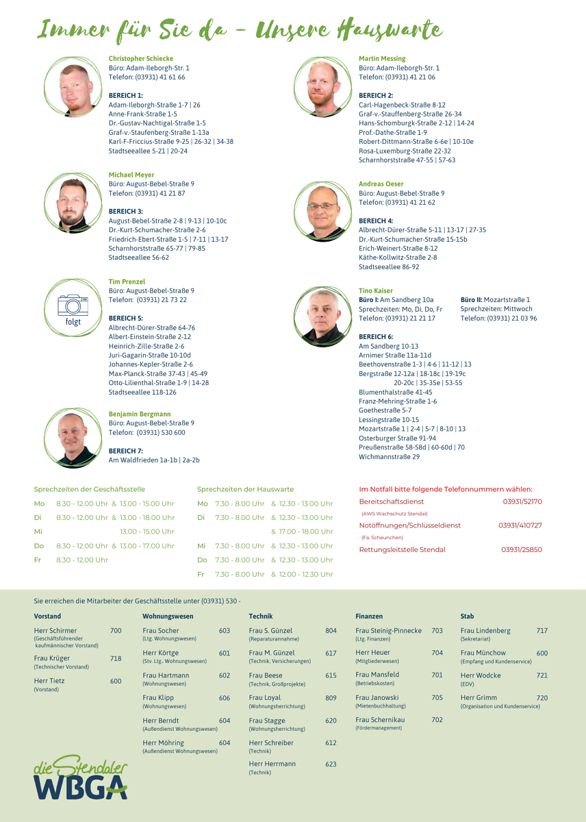 In diesem Zusammenhang gibt es auch an anderen Stellen ein paar Änderungen bzw. Optimierungen der Gebietsaufteilung. Die wohl größte Änderung ist, dass die Bewohner unserer Objekte in Nord, der Bahnhofsvorstadt und der Arnimer Straße sich zukünftig über Hr. Kaiser als einen sehr erfahrenen und freundlichen Hauswart freuen können. Dieser sollte hier schon ein bekanntes Gesicht sein, denn er hatte bereits in einer Übergangsphase viel Zeit hier verbracht und ist auch insgesamt schon einige Jahre bei uns.